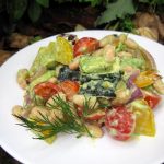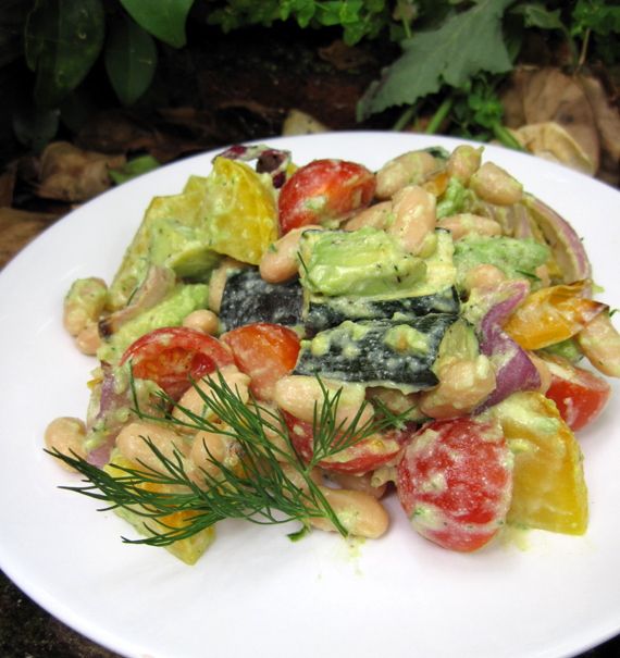 This warm salad incorporates a variety of roasted and raw vegetables, and is finished off with a creamy dressing made with fresh dill, green onions and tofu.