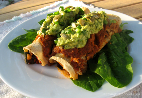 - Guacamole topping: With a fork, mash the avocados with the lime juice, cumin and garlic powder. Mix in cilantro and tomatoes. Spoon mixture on top of enchiladas. Garnish with green onions and pumpkin seeds (optional). You can make this ahead of time if you like, so that the flavors mingle.