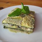 - Next, add half of the onions, half of the mushrooms, half of the basil, and half of the chard/spinach. Pour about half of the remaining sauce over this.