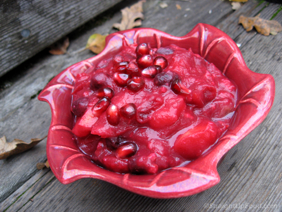 Cranberry sauce is not only part of American tradition, but also Canadian and some European traditions. Try this zipped-up version with apples and pears, walnuts and raisins. Dates are used instead of refined sugar, and a few pomegranate seeds add a bit of whimsy.