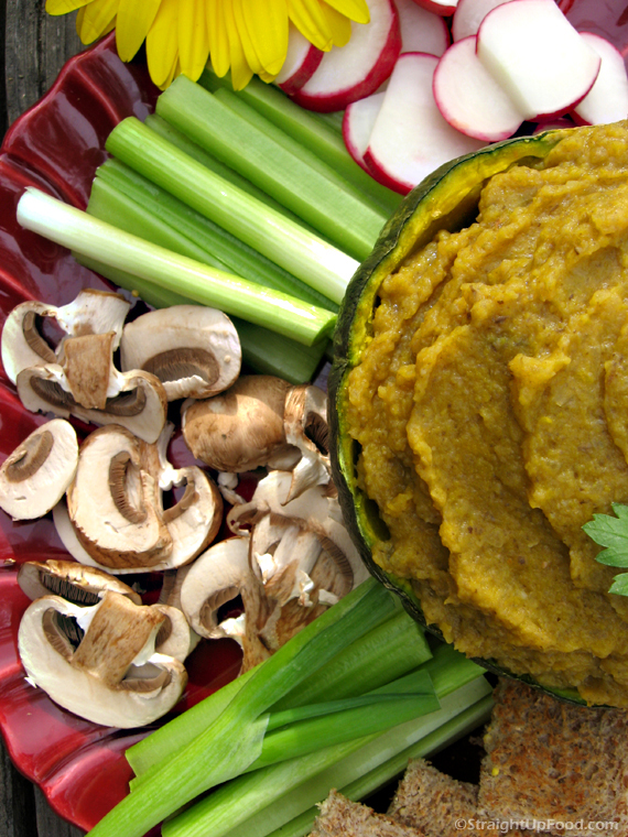 - Scrape the seeds out of the cooked squash and discard them. With a spoon, scrape the squash out of the skin and place into the bowl of your food processor along with the onion, mushrooms, beans and garlic (add any remaining cooking water as needed to thin). Blend until smooth. Serve with raw vegetables as a dip, or use as a sandwich spread. You may use the squash skin as a bowl if using as a dip (as shown).