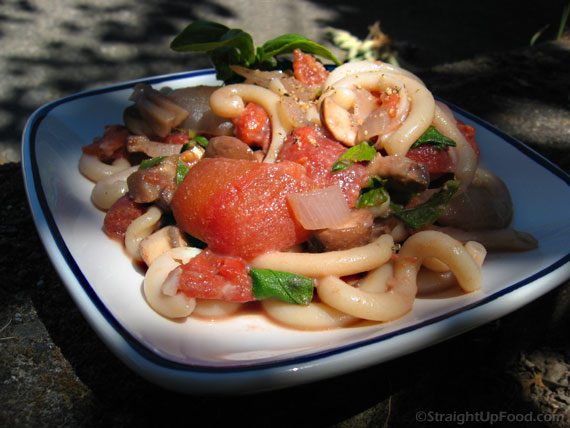 - Stir the tomato sauce into the pot of pasta, along with the chopped basil. Serve as is, or topped with finely ground cashews or walnuts (using a rotary cheese grater to create a parmesan-like topping).