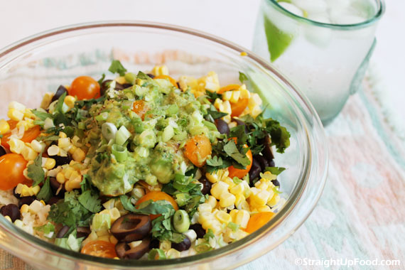 Burrito bowls have come into fashion as more people cut out refined carbohydrates, in this case the flour tortilla. This filling dish can be a meal in itself. It is flavorful, colorful, easy to make, and the simple lime juice dressing is just right.