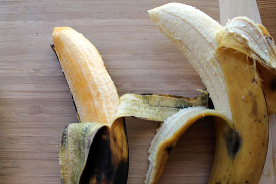 Above: A very ripe plantain on the left and a less ripe one on the right; use the one on the left.