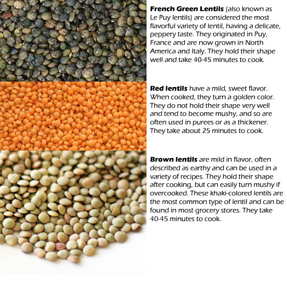 Lentils: A variety of lentils exist (see chart below), and can be used in this recipe by adjusting the cooking time slightly (mainly for red lentils, which take only 25-30 minutes to cook).