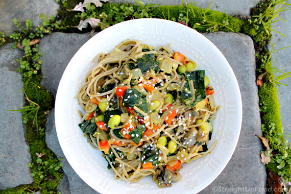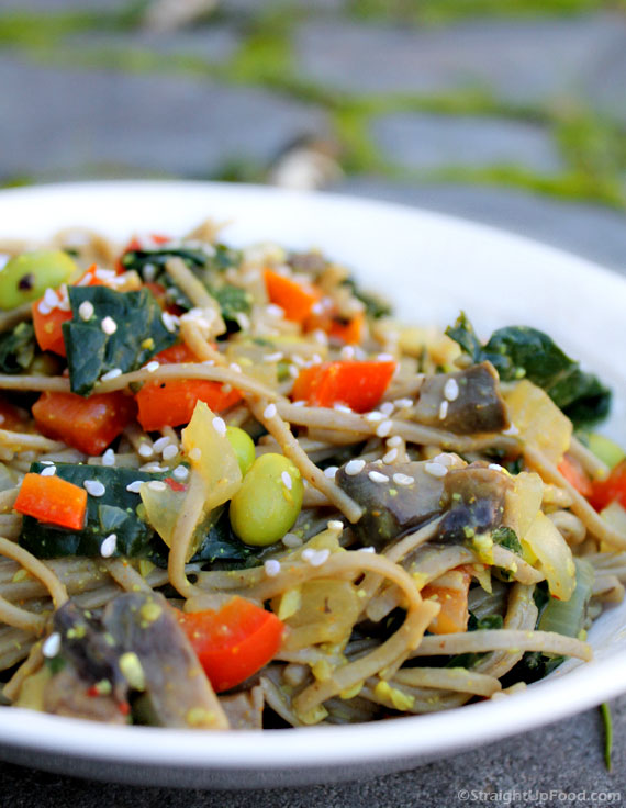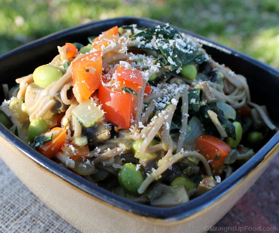 Noodle alternatives: If you are not into noodles, try substituting some peeled and cubed winter squash (butternut, kabocha, delicata) in with the sauted vegetables. Spaghetti squash would also be nice. Aside from squash, try some brown rice, diced potatoes, or broccoli and cauliflower florets.