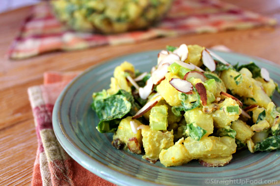 Out of the ball park with this recipe Cathy! I had some "yams" from the farmer's market and subbed out the spinach with kale (put it in the cooking water for the last minute) and it all turned out delicious! I love the fresh OJ with the curry. The almonds and celery add a nice crunch. You have a way with putting together flavors and textures in a very satisfying way. Love it!