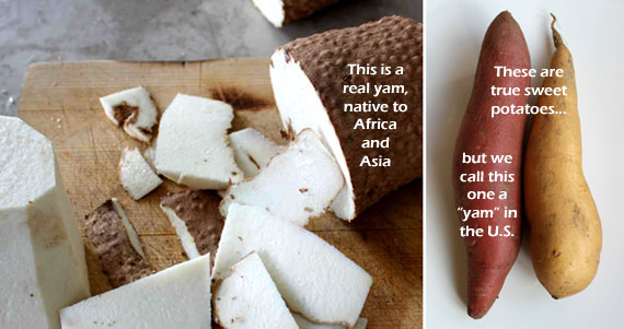 Above: Interestingly, sweet potatoes and yams are not related; they are two different species of root vegetable. The orange-reddish "yam" and the golden sweet potato (right) that we find in U.S. grocery stores are actually both varieties of sweet potato, but the orange-red ones were dubbed βyamsβ to distinguish the two. True yams are native to Africa and Asia (left), and are very starchy with dark brown, tree bark-like skin. To read an article about sweet potatoes vs. yams, click here.