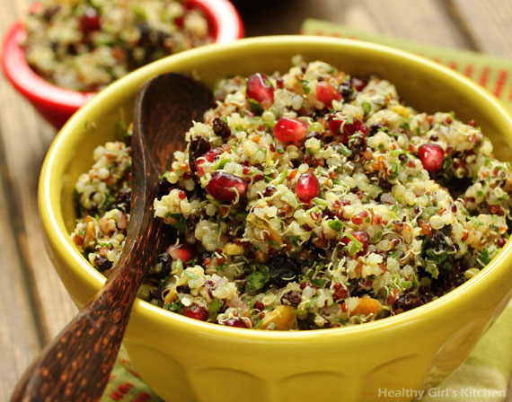 Quinoa comes in various colors: white/yellow, red, black, or a mix of all three. Any color works in this recipe; the multi-colored quinoa gives it even more visual appeal. To learn more about quinoa and see photos of the varieties, see my Holiday Quinoa Dressing recipe.