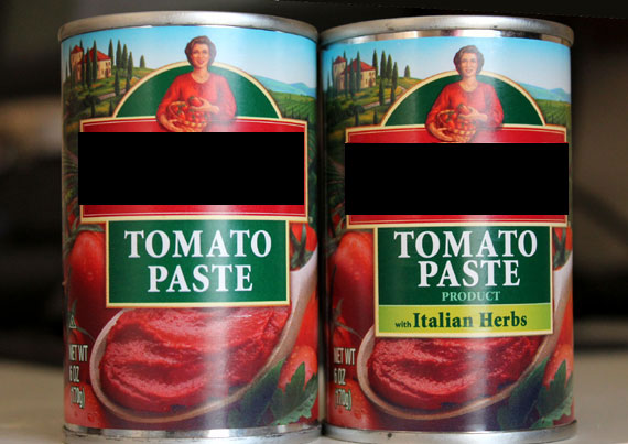 One thing that jumps out at me, that I didn't see anyone else mention, is that if you look carefully at the two (almost identical) labels, you will see that one is listed as "Tomato Paste" and the other is listed as "Tomato Paste PRODUCT" (emphasis mine). That should make anyone pause if they read labels at all. It's like the difference between something labeled, "100% Cranberry Juice" vs. "Cranberry Juice Cocktail". Not the same thing, at all.