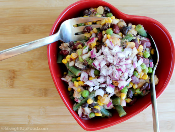 In addition to beans, this salad features corn, peas, and red onion. The dressing is a tangy and mildly spicy vinaigrette. This is a colorful, hearty salad, perfect for any of the three P's: potlucks, parties, and picnics!