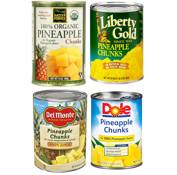 Above: These are just four brands of no-sugar-added canned pineapple, just 100% pineapple juice. Be sure to steer clear of any that say "in heavy syrup" or even "in light syrup." Pineapple is so sweet on its own, no added sugar is needed (more on label reading here). Or you can use fresh pineapple as well.