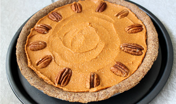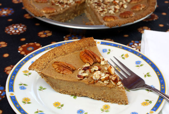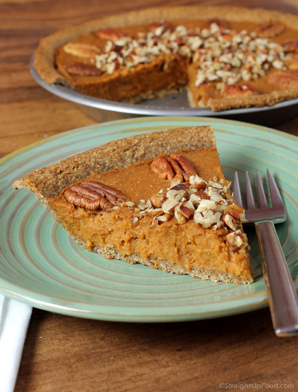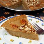 This delicious pie is similar to pumpkin pie but it is made with sweet potatoes (or yams) instead of pumpkin. The filling is sweetened with dates, thickened with a little oat flour, and the Pecan-Date Crust is just like a sweet, crumbly cookie!
