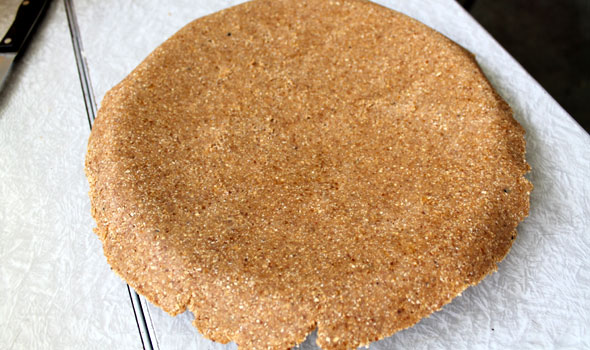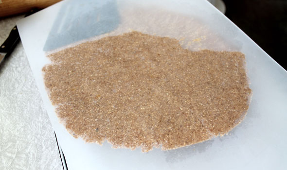 Above: Flip the pie pan, the crust and the parchment paper (or mat) over, and peel away the top parchment paper (or the cutting mat, which I used here; I'm using a spatula on the underside to loosen the crust from the mat).