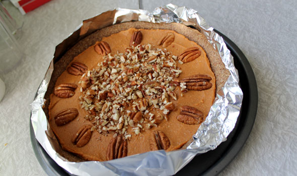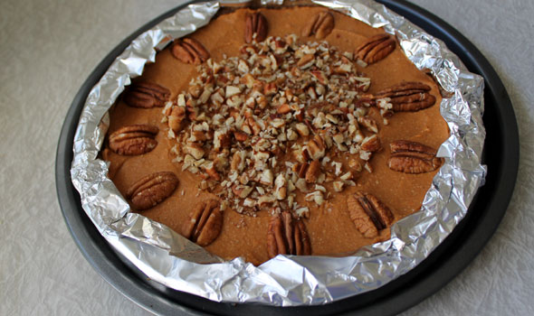 Above: Add the chopped pecans to the center. Place a few aluminum foil strips around the edges to keep the crust from over-browning; secure them underneath first...