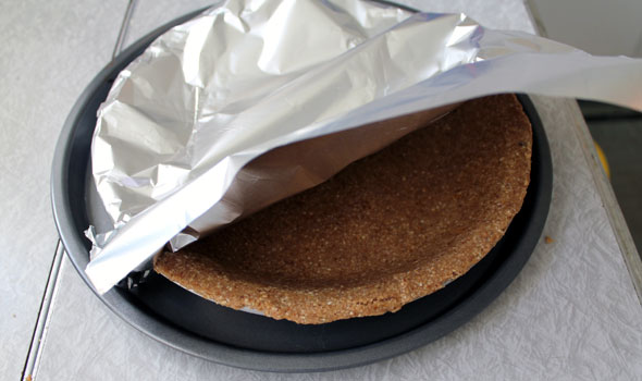 Above: Cover the uncooked crust with foil and loosely curl the edges under. Bake for 10 minutes.
