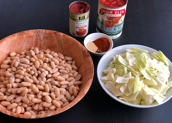 Above: The ingredients for step 2: cannellini beans, cabbage, salt-free tomato paste and diced tomatoes, and spices (I forgot the Italian seasoning in the photo, but still use it!).