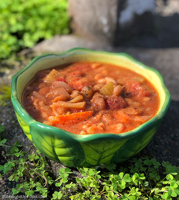 This hearty bean soup is full of flavor from its rich tomato broth and dried seasonings: garlic, smoked paprika, Italian green herbs, and red pepper flakes. Any kind of white bean can be used, but I like the Cannellini best because it's bigger and heartier.